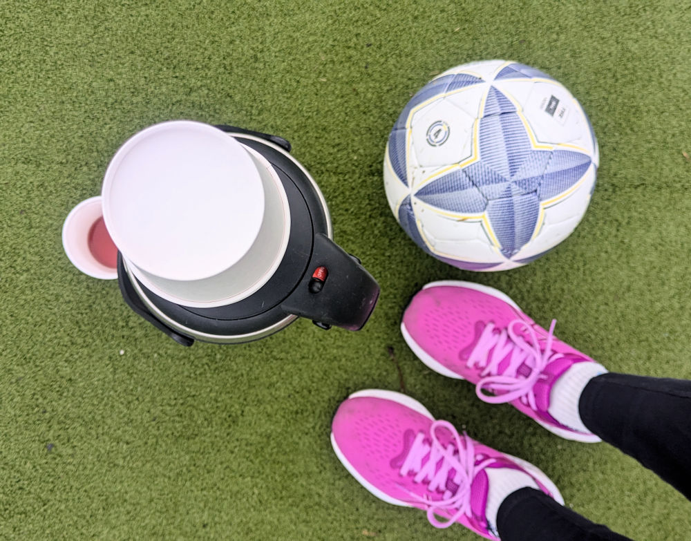 Gut, dass eine Mutter für die Kids eine große Kanne voller Tee mitgebracht hatte, die wir am Spielfeldrand positionierten. Die Jungs spielten heute gegen Ältere eines anderen Vereins.