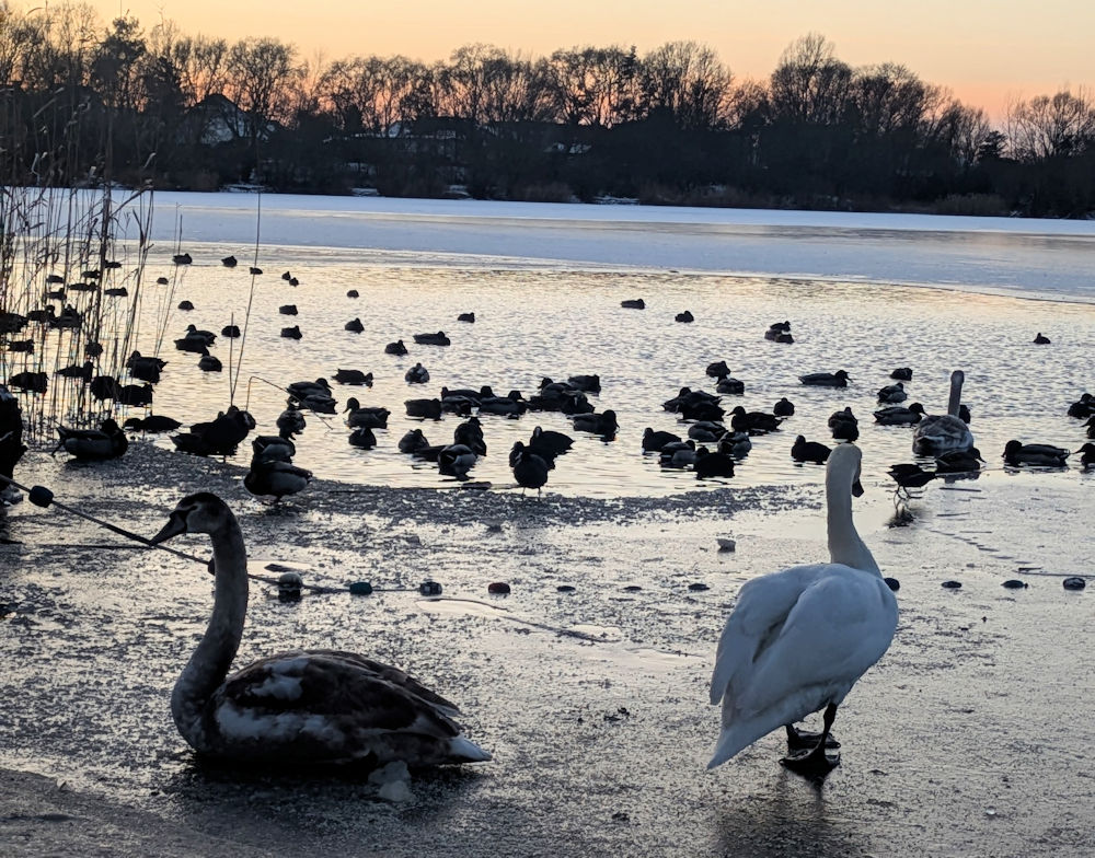 15. Bei einem Abendspaziergang beobachten wir beim Sonnenuntergang die Enten und Schwäne am und auf dem See. Wunderschön.
